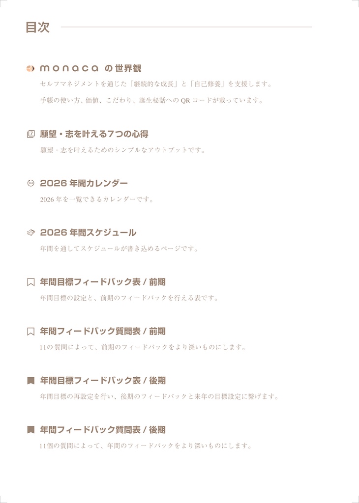 monaca手帳®︎が提供している「継続的に成長し、自ら望む人生を歩む者」になるための内容を紹介します。