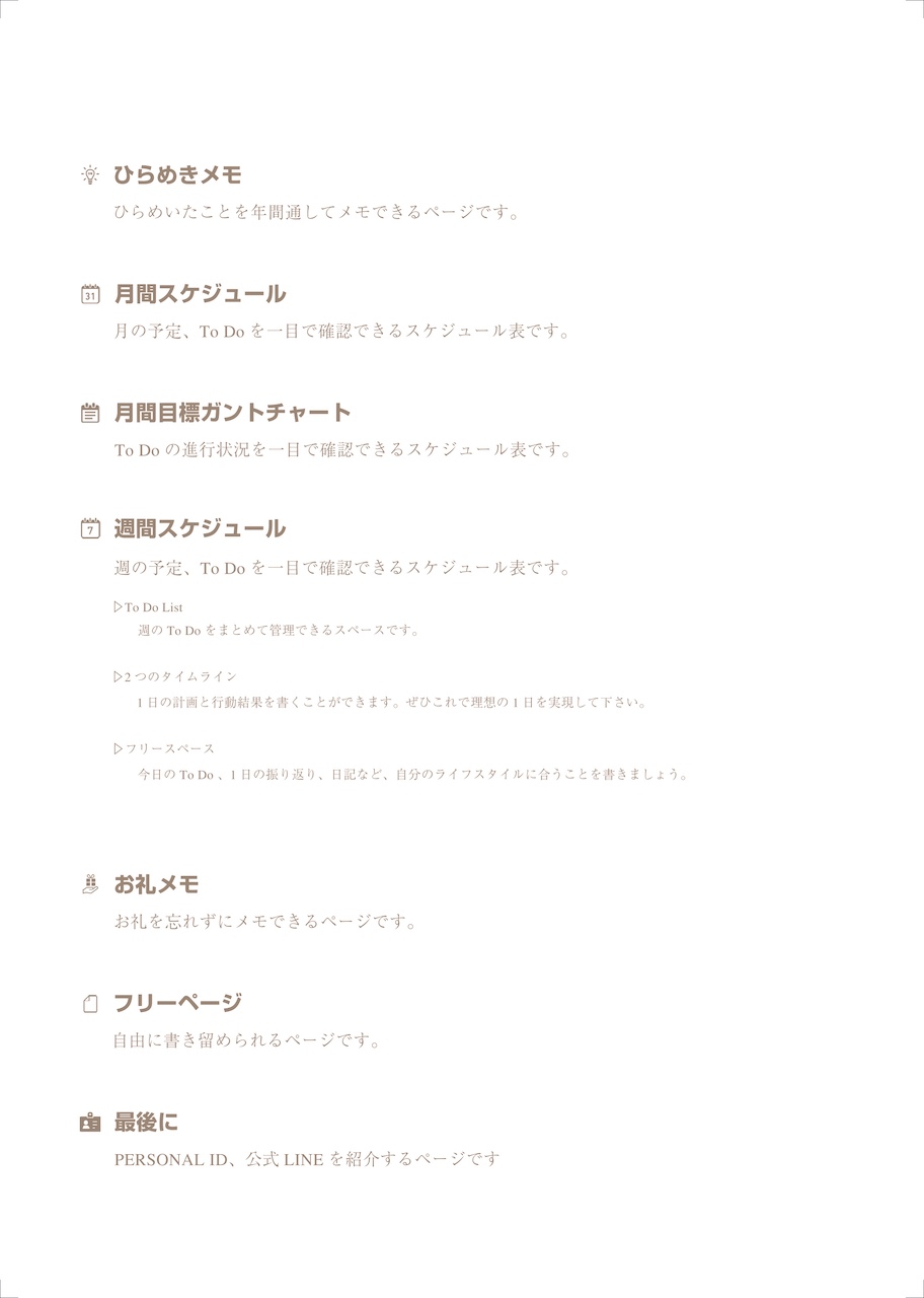 多くのユーザー様を笑顔にしてきた2つのタイムラインを駆使し、忙しい方にもしっくりくるスケジュール帳を見極め、計画と現実とのギャップを最小限にする設計にしています。だからこそ予定が崩れても消さずに書き直せて、予定が伸びたり変更になったとしても想定内のこととしてストレスを感じずに計画を立て直すことができるのです。もちろんユーザー様の価値観を尊重しつつ、良い意味で型にハマって使用するデザインのため、手帳の初心者から上級者まで伸び伸びと使用することができます。「いつまでも成長し続けたいあなたへ」望む人生を自ら提供していきましょう。